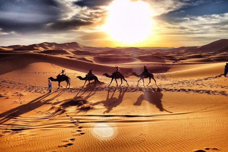 Após o café da manhã, seguiremos de carro para o deserto do Saara, em Merzouga. Exploraremos as Gargantas de Todra e, em seguida, iremos para Erfoud, onde poderemos visitar uma fábrica de fósseis e almoçar. Depois, partiremos para o deserto de Merzouga, passando por Rissani, onde seus dromedários estarão esperando por você. Você será recebido com um copo de chá de menta e um turbante (lenço do deserto) de presente antes de cavalgar em um dromedário, guiado por um experiente tratador, para explorar o misterioso mar de areia do Erg Chebbi. Aqui, você passará a noite sob as estrelas. Jantar e pernoite em um kasbah no deserto, em Merzouga.