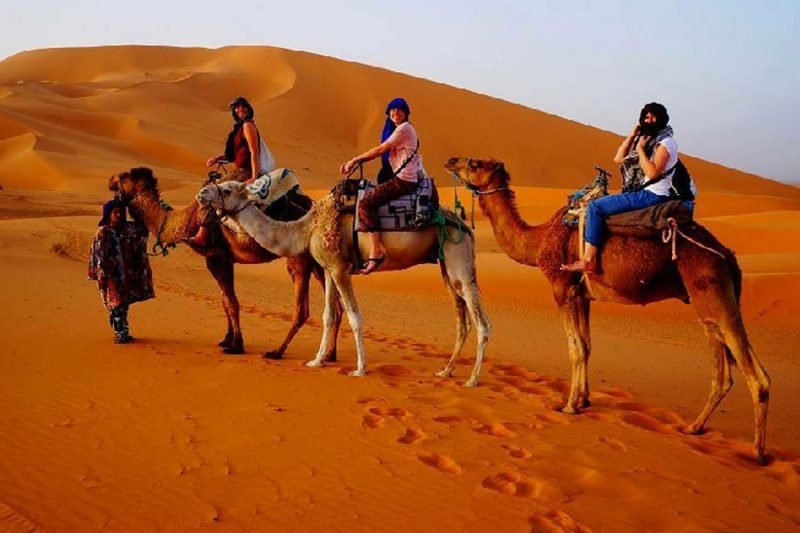 Após o café da manhã, você explorará as pequenas cidades do deserto de Erfoud e Rissani, onde fará uma parada para o almoço. À tarde, você seguirá em veículos 4×4 pelas terras áridas até as majestosas dunas de areia do Saara de Merzouga. Após iniciarmos a travessia pelo campo desértico, onde nossos dromedários nos aguardam, tomaremos um chá. Atravessaremos as dunas até o coração do deserto para contemplar um belo pôr do sol. Escondidos atrás das Grandes Dunas, e ao som da música dos nômades, desfrutaremos de um jantar marroquino e chá, enquanto contemplamos o vasto céu estrelado. Jantar e pernoite em um Kasbah no deserto de Merzouga.