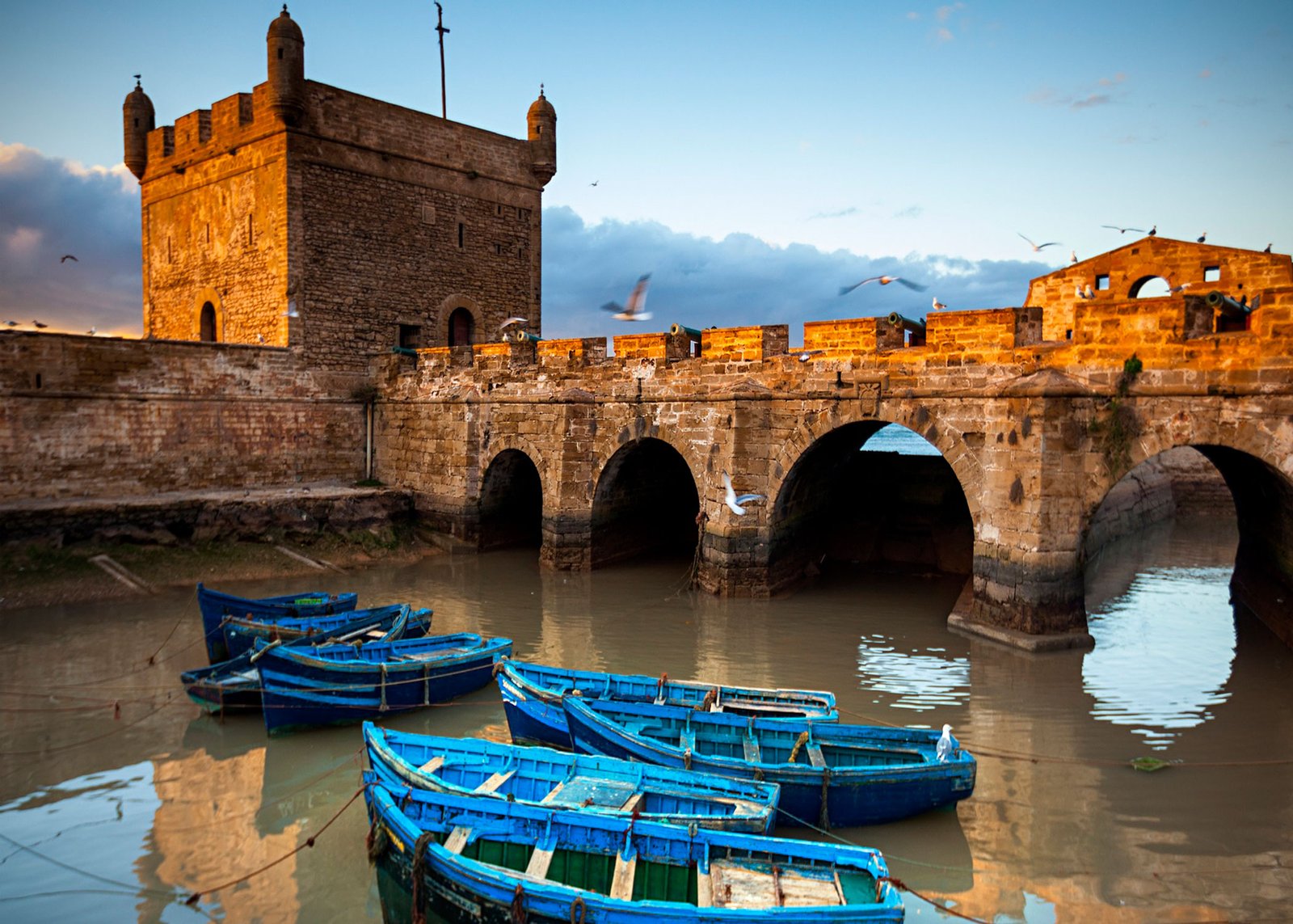 Após o café da manhã no hotel, seguimos de carro para oeste em direção a Essaouira Mogador, uma cidade encantadora conhecida por seus artesãos que produzem peças únicas. A cidade surge repentinamente sobre uma grande península rochosa, com suas paredes brancas, portas e janelas azuis. A beleza do local, a suavidade das cores e da luz, o clima fresco no verão criam uma atmosfera envolvente. O almoço, com peixe fresco, será servido perto da praia da medina.